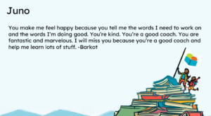 Juno: After rewatching the video I look back at how much fun it’s always been and can be proud that I’m still putting smiles on kids’ faces. Any advice I would give to my youngerself is to keep doing what you like to do. Team Read has always been understanding and has given me so much flexibility to help my student and I always try to adjust the plan to what my student both needs and likes. I’m glad I’ve always been able to keep up my good spirit as a coach.